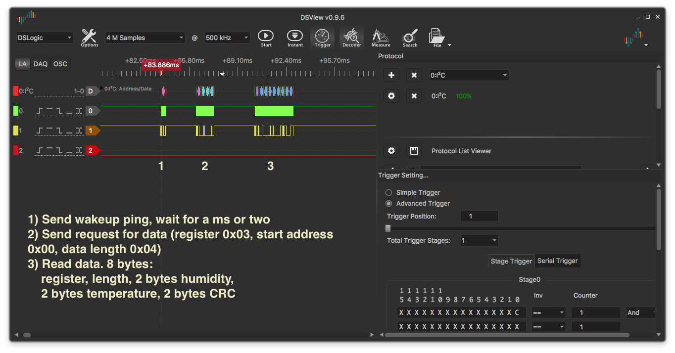 I had to pore over the datasheet (similar to AM2321), look at example code, and finally pull out my logic analyzer to understand the issue. Other people had mentioned that the AM232* sensors aren’t exactly i2c compliant, but never dived into the details of why.