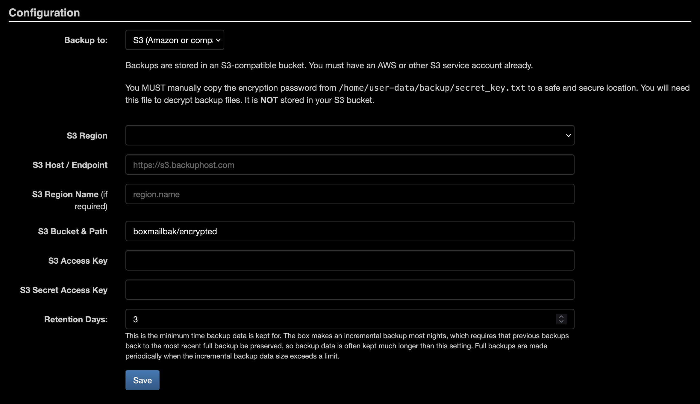 After validating and saving your settings, most of the configuration fields will be empty when you open the backups management page. Just trust that the backup is going to work, and confirm it by checking the logs and peeking in your S3 bucket the next day :-)
